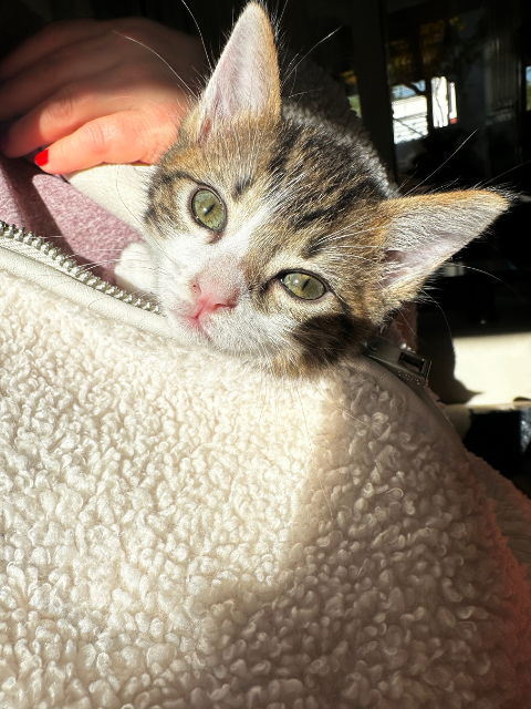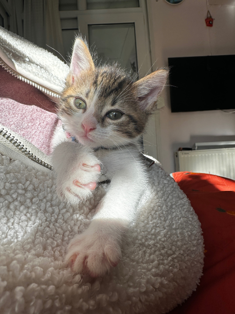 Bu dostumuz, kardeşiyle birlikte bir ayakkabı kutusunun içinde gece bahçeye bırakıldı. Bırakıldıklarında henüz iki haftalıktılar. Şu an bir buçuk aylıklar; palazlandılar, çok enerjik ve neşeliler. Tuvalet eğitimini aldılar ve kuru mamaya geçiş yaptılar. Güzel ve şefkatle bakılacak bir yuvaları olmasını istiyoruz.