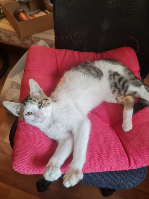 Eşek’i boynunda bir yarayla sokakta bulduk. Veterinere götürüp yarasına ilk müdahaleyi, kuduz ve parazit aşılarını yaptırdık. Evimizde dört kedi daha var ve Eşek bu nedenle diğer kedilerle yaşamaya alışık. Kum eğitimi var ve kuru mama yiyor.