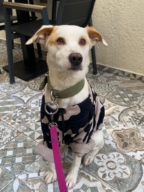 Alsancak'ta boyun tasması ve ona bağlı bir ip ile geziyordu. 2-3. görüşümde sevmek için yanına gittim; ancak elden korkuyordu. Ben de o yola doğru gidince ipe bastım; sonra benimle beraber gelmeye başladı. Zabıta, esnaf, otoparklar... Herkese sordum; ancak herkes "Sizin miydi?" dedi. Başkaları da görmüş, sormuş; ancak kimse köpeği tanımıyor. Çipi yok. Biz bir süreliğine yanımıza aldık; yıkadık, iç-dış paraziti yapıldı. Bir sağlık sorunu vardı; ilaçlarına devam edebilmek için bir arkadaşımızda kaldı.