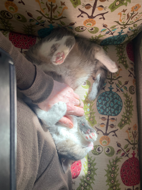 Veteriner kontrolünden sonra geçici yuvası olarak evimize aldık. Çok oyuncu, sevecen, sevgi dolu bir ufaklık. Akıllı ve sol patisini kullanan solak bir kedicik. Sizi dinliyor ve anlıyor. Maalesef ki evdeki kedimiz Siyam cinsi ve 6 yaşında, evin tek kraliçesi olarak onu kabullenmedi. Yoksa Kitty tüm sevecenliğini gösterdi. Umarım onu evde kabul edecek, ömürlük yuvasını bulur. Kedilerle arası iyi, maalesef bizim kedi ürkek ve tek merkez olmak istedi.