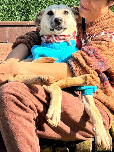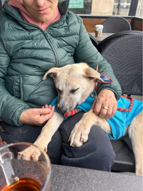 Yavruyken otoban kenarına terk edildi. Araba çarptı ve ayağı kırıldı. İyileşti. 5 aydır padok pansiyonda ve hâlâ neşesini yitirmedi. Yitirmeden ona ömürlük ailesini arıyoruz. Yeni evindeki adaptasyonu için köpek eğitmenini de biz karşılayacağız. Çok sosyal, çok evcil. Bir kez onu sosyalleştirip kahve içmeye gittik; kucağa kafasını yaslayıp uyudu.