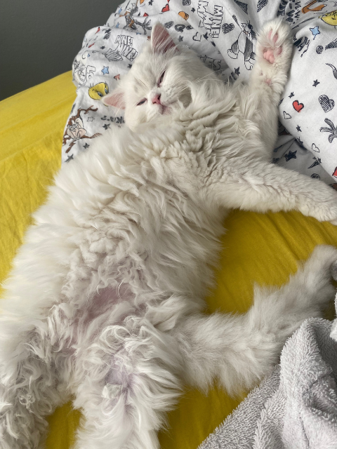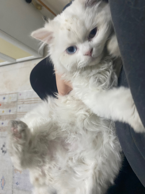 Cins bir kedi olan Sütlaç çok uysal; doyduktan sonra sokağa bırakılmış. Henüz 6 aylık ve oyun seviyor. Kedi alerjim olduğu için, soğukta ölmesin diye eve alsam da ona ömürlük bir yuva bulmam lazım. İlk parazit aşısını yaptırdım.