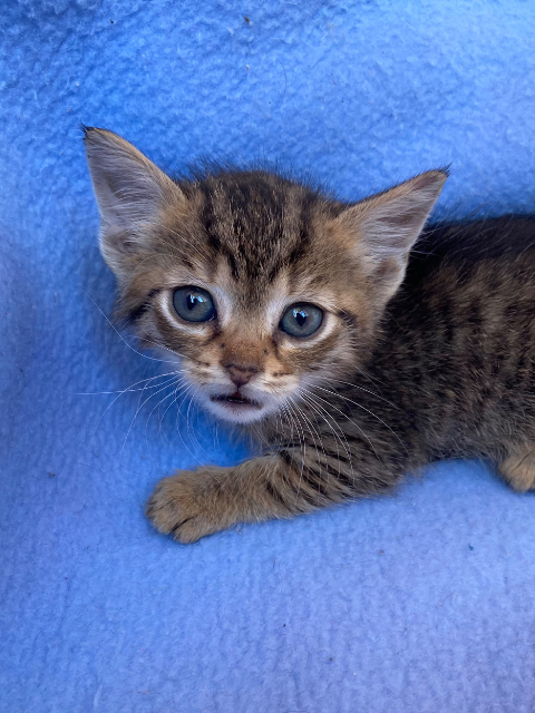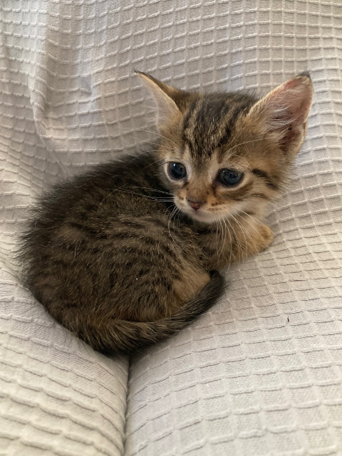 Araç trafiği olan bir orta refüjde, çalıların arasında bulundu. Miyavlıyordu ve yola çıkmak üzereydi. Annesinin ölmüş olduğunu tahmin ediyorum; yanında başka bir kedinin ölüsü vardı. İç ve dış parazit uygulaması yapıldı.